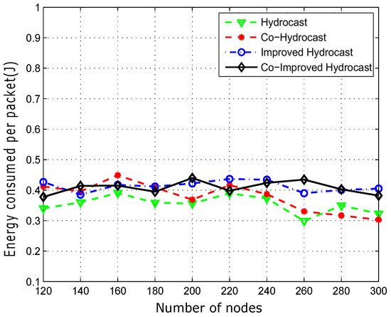 In Figure 13, the average energy consumption of the successfully delivered packets is shown. Improved Hydrocast has low energy consumption due to the establishment of short recovery path for void nodes. The strategic deployment of sensor nodes in the Improved Hydrocast played an important role in reducing the length of recovery paths in the sparse network conditions. Co-Improved Hydrocast scheme consumes more energy than the Improved Hydrocast due to the opportunistic cooperation technique that is implemented to reduce the packet drop ratio in the network. In cooperation, the relay node also forwards the packet to the destination which results in more energy consumption. In Hydrocast, the energy consumption for each data packet delivery is higher than the other two proposed schemes. Recovery paths for void nodes in Hydrocast are lengthy in sparse network conditions, due to which more energy is consumed to deliver the data packet to the destination. Co-Hydrocast consumes more energy to deliver data packets because of cooperation technique and lengthy recovery paths for void nodes in sparse network condition. Both Co-Hydrocast and Co-Improved Hydrocast uses cooperation technique for reducing packet drop ratio however the deployment of sensor nodes at the strategic locations enabled void nodes to establish a short path for the data packet transmission to the destination.