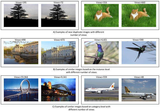 Social interactions in online social media are classified into explicit or implicit interactions. Explicit interactions require time and effort from the registered users and are denoted by the number of comments and favorites on the Flickr platform. Implicit interactions are represented by the number of views; however, this social metric is not necessarily a reflection of Flickr members’ interest. Hence, the gap between explicit and implicit interactions is significant, yet they have a strong positive relationship. This is a valid observation in our dataset, and the correlation between the number of views and the number of comments equals 0.48. From our dataset, we also observe that images which include similar instances or objects may not acquire a similar level of social interactions. In Figure 2, we illustrate three examples of visually similar images which, despite the similarity, received different numbers of views: (A) near duplicate images; (B) images share the same instances; and (C) images belong to the same category. This highlights the fact that visibility on social media is not solely dependent on visual content. The following questions arise: If visual content is not sufficient to increase social interaction, what are other factors that influence interactions on social media? How can we leverage these factors that increase image visibility and subsequently boost social interactions? Thus, understanding online social behavior is a fundamental step in the prediction process. In order to address these questions, we analyze the interactions between users and images, considering how users browse the social media sites. This leads to three main points that need to be investigated: Do users find images only by browsing the images uploaded by their contacts or do they find interesting images through survey groups that cluster photographs based on themes? Finally, how does searching for images using keywords affect the visibility of images and the number of social interactions? To find the answers, we construct two samples of images from our original dataset. The first set represents photos with a high number of views; we refer to this set as the representative dataset. The other set of photos contains randomly selected images with a varying number of views to represent the distribution of image popularity; this set is denoted as the random dataset. The descriptions of the two datasets are provided below: