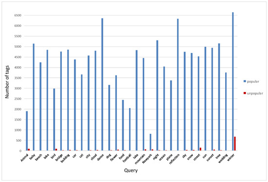 The gap between the number of tags associated with popular photos and unpopular photos.