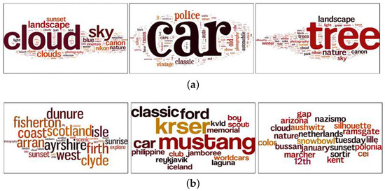 We went a step further and collected new images from Flickr to analyze the text assigned to these images. We searched for images using the same queries that we used to return the group images (31 different visual concepts) and returned photos based on interesting values calculated by Flickr. Through this step, we obtained two sets of images, interesting images and uninteresting images, based on Flickr’s interestingness score. Comparable to our findings using our datasets, the difference in the number of tags is significantly high. Figure 3 shows a comparison of the number of tags assigned to the 1000 most popular and most unpopular images belonging to the same visual category. Moreover, we analyzed the text used to describe popular and unpopular images and generated tag-clouds to depict the most frequently used words. Figure 4 presents the tags associated with popular and unpopular photos; we can see that popular tags are typically common words such as cloud, car, and tree. The majority of unpopular images lack titles and descriptive text and are associated with fewer tags, if any. In general, these tags are more specific, in that they describe specific attributes regarding the image visual content, such as the car’s brand. Furthermore, the text is not comprehensive, and only covers a portion of the visual content and the semantics of the images; unlike interesting images that are rich in textual information. Most of the popular images are uploaded with informative titles and descriptions. In addition, the photos are annotated with tags that describe visual content besides human semantic concepts. These tags are more descriptive and include more searchable keywords, which increases the chance that the images will appear in the search results. The same observation applied to our datasets in terms of tags and description quality.