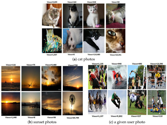 Prior studies attempted to address the topic of predicting an image’s popularity with content and/or social factors [9,10,11] by utilizing basic features. In [12], the authors combined social context with low level and deep learning features to determine what makes an image popular, while [13] only considered an image’s visual content using deep learning features to distinguish between popular and unpopular scenes that affect an image’s popularity. In [14], the authors addressed the visual sentiments that impact an image’s popularity. In our work, we address the problem by first scrutinizing the social behavior in Flickr to determine how users browse social photo-sharing sites and then analyzing the correlation between users and an image’s social factors with regard to social popularity. In addition, we investigate the role of associated text in an image’s popularity. We conclude that three factors, social behavior, visual content, and surrounding text, absolutely influence the photos visibility to other users and subsequently its popularity.
