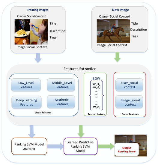 Yamasaki et al., in [9], proposed to predict image popularity scores by utilizing tag information. They computed the tag’s importance by combining the tag frequency and weight learned from support vector regression. This method obtained better results than predicting popularity based on tag frequency scores. Their approach is cost effective but fails to predict the popularity score if there is no tag information. Learning the rank of an image, in terms of popularity based on visual features, was introduced in [13] by Cappallo et al. They used deep learning features to discover latent scenes that affect the popularity of images. Another approach was proposed by Wu et al. [25], who predicted image popularity using a matrix factorization technique. They utilized the temporal information of the interaction between users and images.