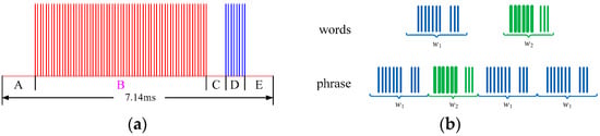 To analyse MFR signals more effectively, a commonly used layered model for MFR signals, developed by Haykin and Visnevski [], is introduced. They put forward the definition of radar “words” as static or dynamically varying groups of pulses that MFRs emit in different states, which can be viewed as fundamental building blocks of the MFR signals. Take, for example, the “Mercury” airborne MFR given in [,,], whose radar word structure is shown in Figure 1a. Its words are all of equal length of 7.14 ms and made up of five sections A–E. Sections A, C, and E are dead time of known duration. Section B is a fixed pulse repetition interval (PRI) pulse-Doppler sequence, and D is a scheduled PRI synchronization burst with 12 pulses. A radar “phrase” is made up of a finite number of words in a fixed order, such as the phrase ‘w1w2w1w1‘ in Figure 1b.