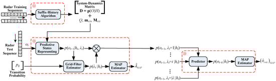 As for the prediction of MFR signals, few studies are reported in public literature. Considering that the MFR signals intercepted by ELINT systems can be used as training samples, the data-driven predicting methods [,,,] should be proper alternatives. Predictive state representation (PSR) [] is a data-driven dynamic system model, which has the advantages of being more generic, more powerful in representation, and easier to learn. Wolfe proposed the multi-mode PSR (MMPSR) which is able to model uncontrolled dynamical systems that switch between several modes of operation [], providing new thoughts for solving this problem. Although PSR models can be naturally used as a predictor [] to calculate the exact prediction probabilities, the normal algorithm that directly makes use of the property of linear PSR is also to be improved in computational complexity, in particular for the high-dimensioned PSR model of MFR.