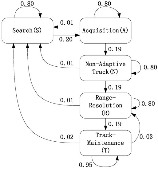 Taking the “Mercury” radar given in [,,], which has five operating modes, denoted as search, acquisition, non-adaptive track, range resolution and track maintenance, for example. The mode transition of the MFR is shown in Figure 3, where the values denote the probabilities of corresponding mode transitions.