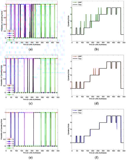 Comparing with the results in Figure 4d,f which are yielded via the PSR-based methods, the dashed line in Figure 4b frequently deviates from the solid line, suggesting that the PSR-based methods significantly outperform the HMM-based method in MFR mode recognition. With the PSR model, the mode distribution yielded by grid-filter-based and the proposed method are shown, respectively, in Figure 4c,e. The figures indicate that the highest probability, which represents the recognized mode, is close to 1 at each moment. This suggests that the results yielded via both of these two algorithms are of high credibility.