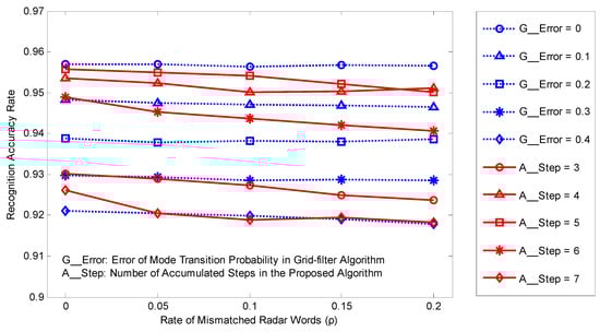 The positions of the dotted lines in Figure 5 suggest that the recognition rate of the grid-filter-based algorithm decreases with increasing error of transition probability, while the solid lines representing the proposed method shows that with increasing accumulated steps, the performance gets better first, and then becomes worse, reaching the top when the number of accumulated steps is 5. This is because the fewer the accumulated steps for mode recognition, the less information is used; however, when the number of accumulated steps is too large, the recognition rate will be limited by the delayed recognition of changing modes. Moreover, the recognition rate changes quite slightly with different ρ, suggesting that both the algorithms are not sensitive to errors in the training sequences, which attests to the algorithms’ robustness.