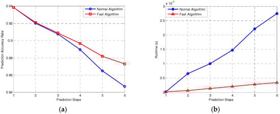 Figure 6a shows the prediction accuracy based on the two algorithms. As the trends of the curves present, the accuracy decreases generally with increasing prediction steps. This also suggests, unexpectedly, that the fast algorithm outperforms the normal algorithm. We analyse the data and discover that this is because the input of the normal algorithm is the state sequence with probability distribution, and that all the error of the intermediate results is accumulated continually with the increasing number of prediction steps. Conversely, in the fast algorithm, the error will be generally reset to zero after the MAP estimation; thus, the performance is even better than that of the other, in particular for high-step prediction.