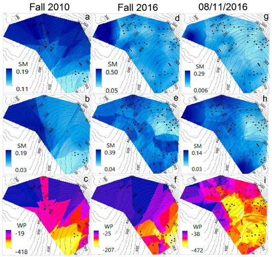 | Interpolated Surface | SM (m3·m−3) at 10 cm | SM (m3·m−3) at 30 cm | WP (kPa) at 30 cm | |||||||||