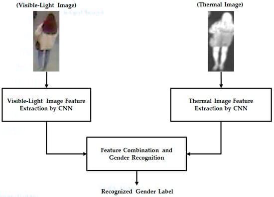In this study, we used two different types of images of the human body for the gender recognition problem. As mentioned in Section 1, the previous studies by Cao et al. [10] and Guo et al. [11] used only visible images for the gender recognition problem. Owing to the large variation of the human body, such as the variation of clothes, accessories, hair styles, and other factors, gender recognition accuracy using only single visible-light images is limited. Therefore, as suggested by Nguyen et al. [5,12], this study used an additional type of human body image, called a thermal image, to enhance the recognition accuracy. The details of our proposed method are presented in Figure 1.