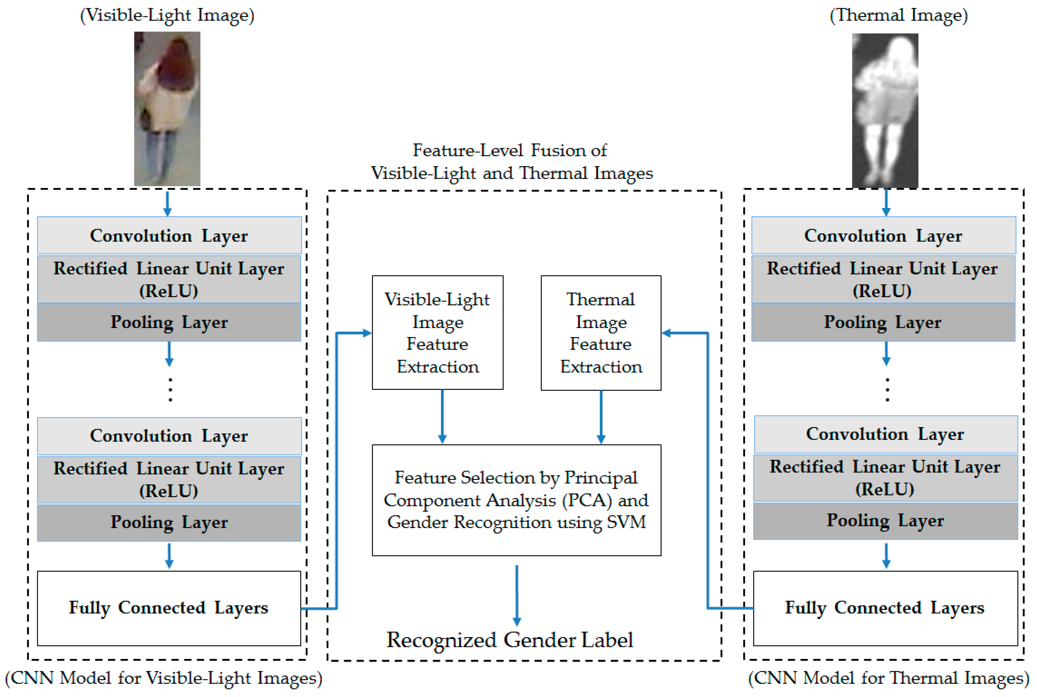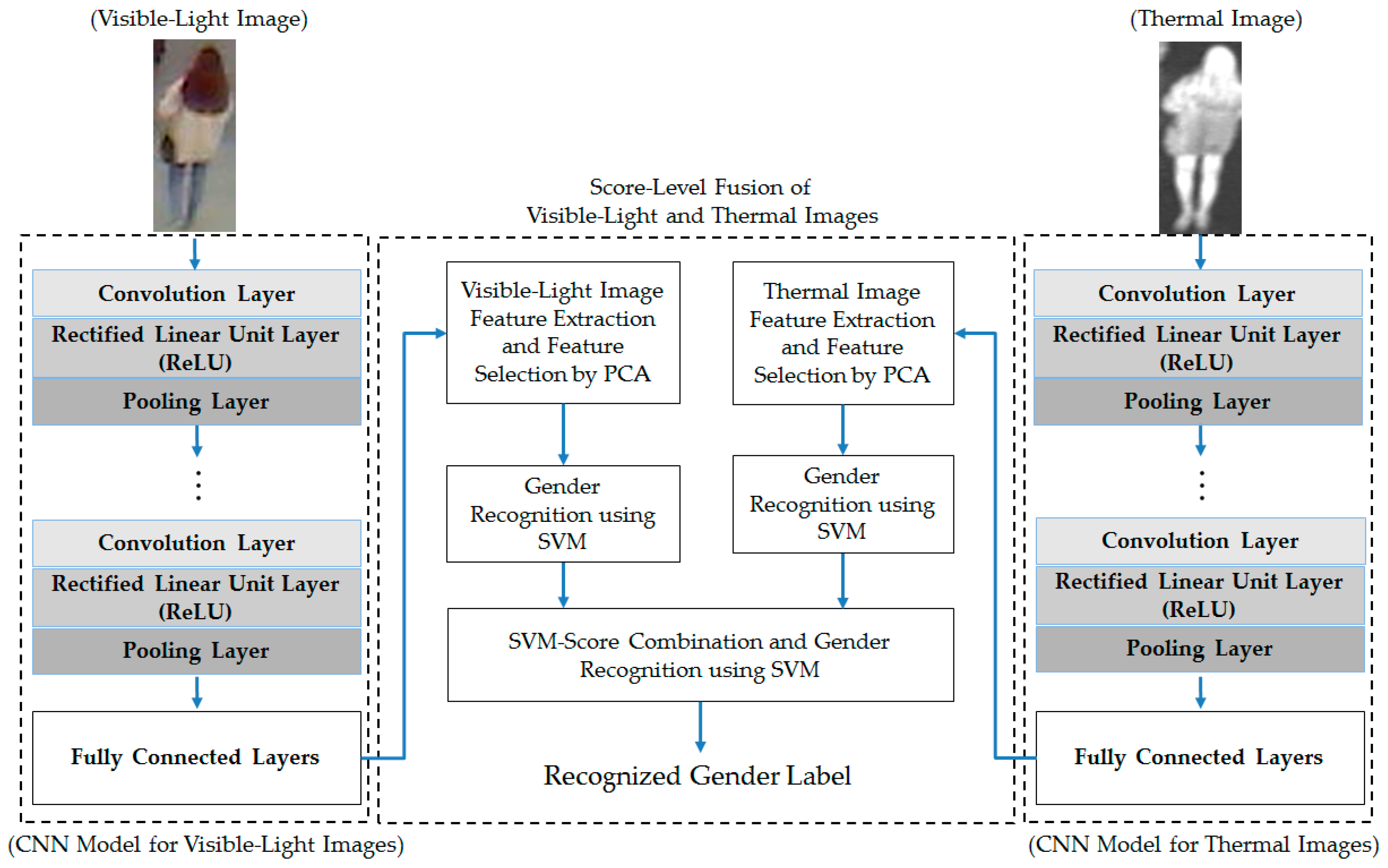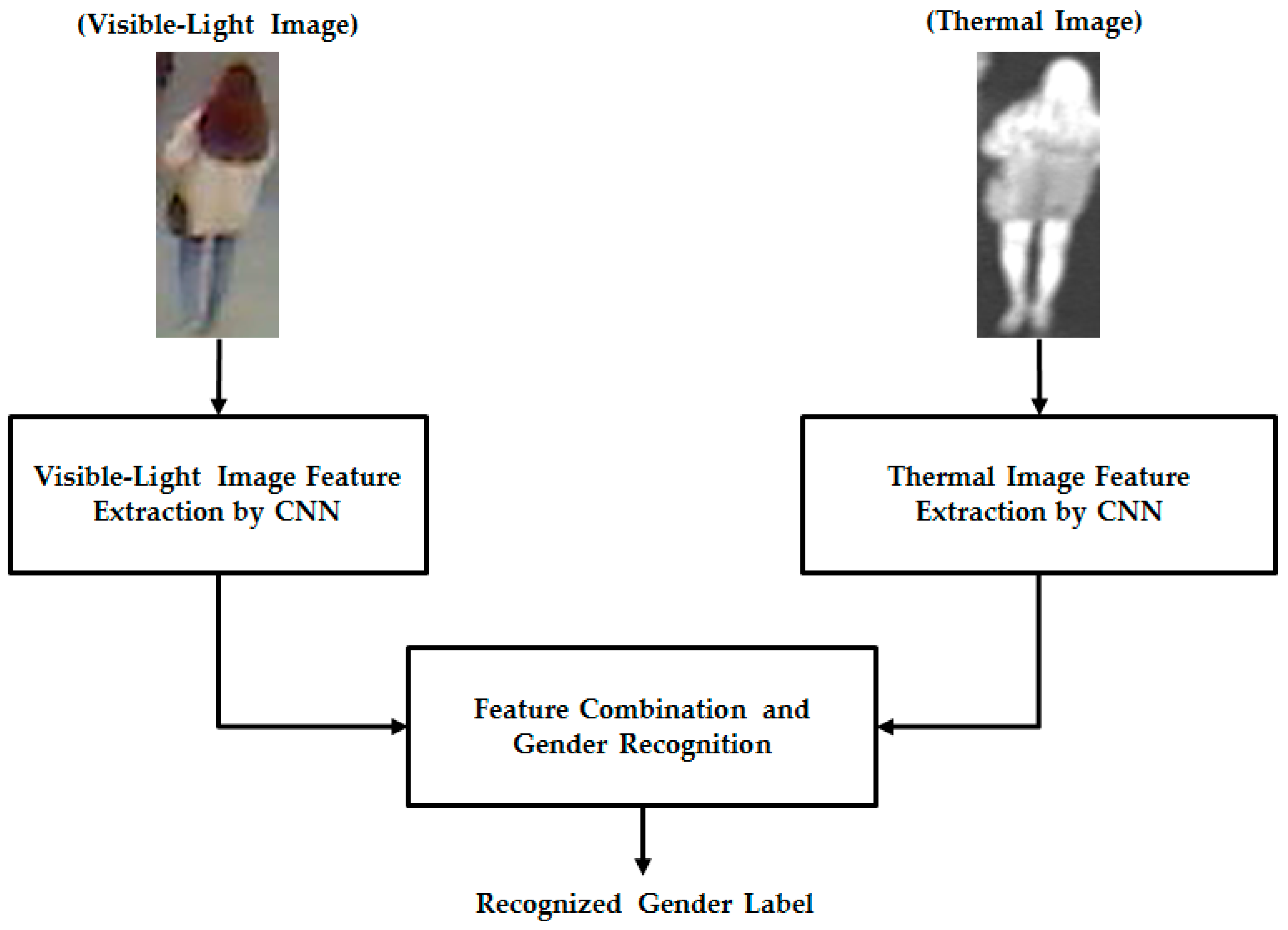 - Fourth, we combine the extracted image features (by the CNN method) from the visible-light and thermal images and perform noise and feature dimension reduction by principal component analysis (PCA). Finally, gender classification is performed by SVMs to enhance the recognition accuracy.