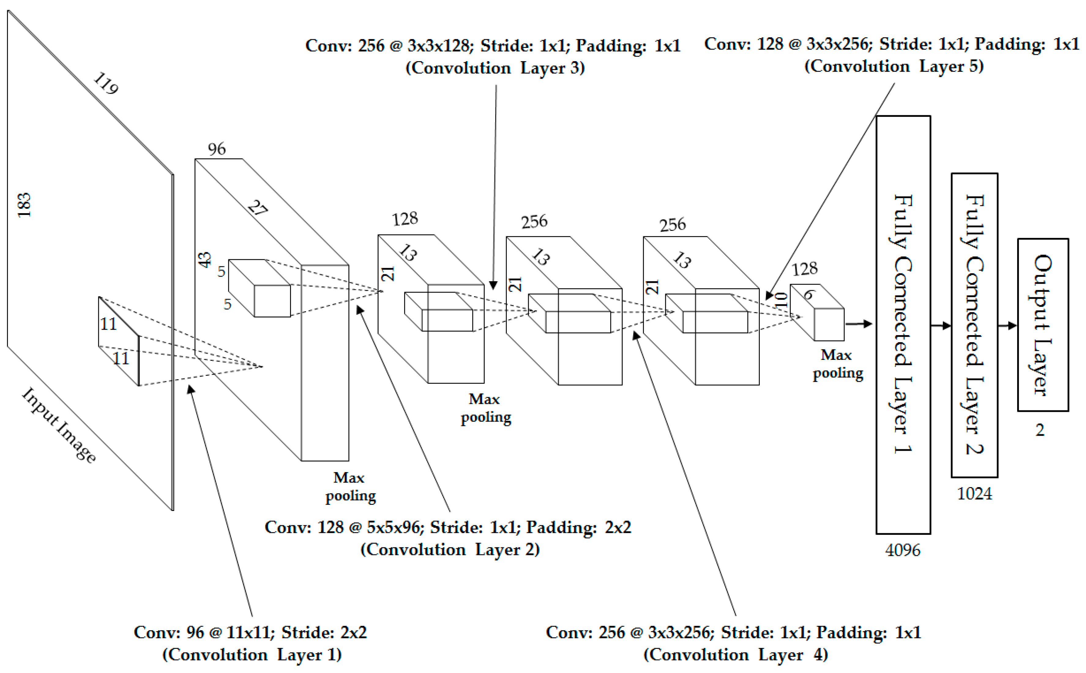 For the first convolutional layer of our CNN structure, the input images of 183 × 119 pixels (visible-light or thermal images) are given to a convolutional layer with 96 filters of size 11 × 11 pixels at a stride of 2 × 2 pixels in the horizontal and vertical directions. To make the CNN structure robust to image translation, the 96 feature maps are fed to a max-pooling layer. As a result, the outputs of the first layer are 96 feature maps of size 43 × 27 pixels, as shown in Figure 2 and Table 2. To fine-tune the first layer, we placed the second layer after the first layer with 128 filters of size 5 × 5 × 96, a stride of 1 pixel, and padding of 2 pixels, followed by another max-pooling layer. Using the first two layers, we obtain 128 feature maps of size 21 × 13 pixels, as shown in Figure 2 and Table 2. The first two layers are used to extract the low-level image features, such as edges or blob texture features.