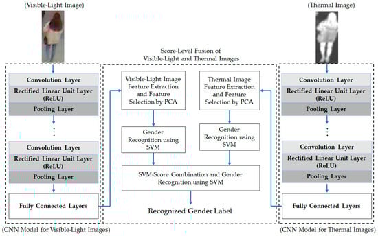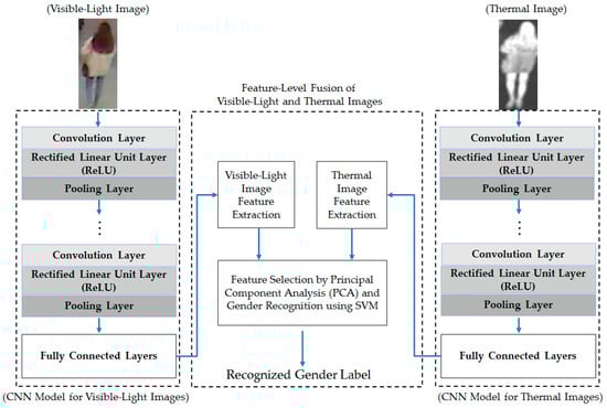 Finally, the extracted features from the visible-light and thermal images using the CNN method are combined and the gender is recognized using SVM. As suggested by Nguyen et al. [5,12], our proposed method combines visible-light and thermal images using two combination methods, i.e., feature-level fusion and score-level fusion, for gender recognition. Detailed explanations of the feature extraction and gender recognition are presented in Section 2.3.