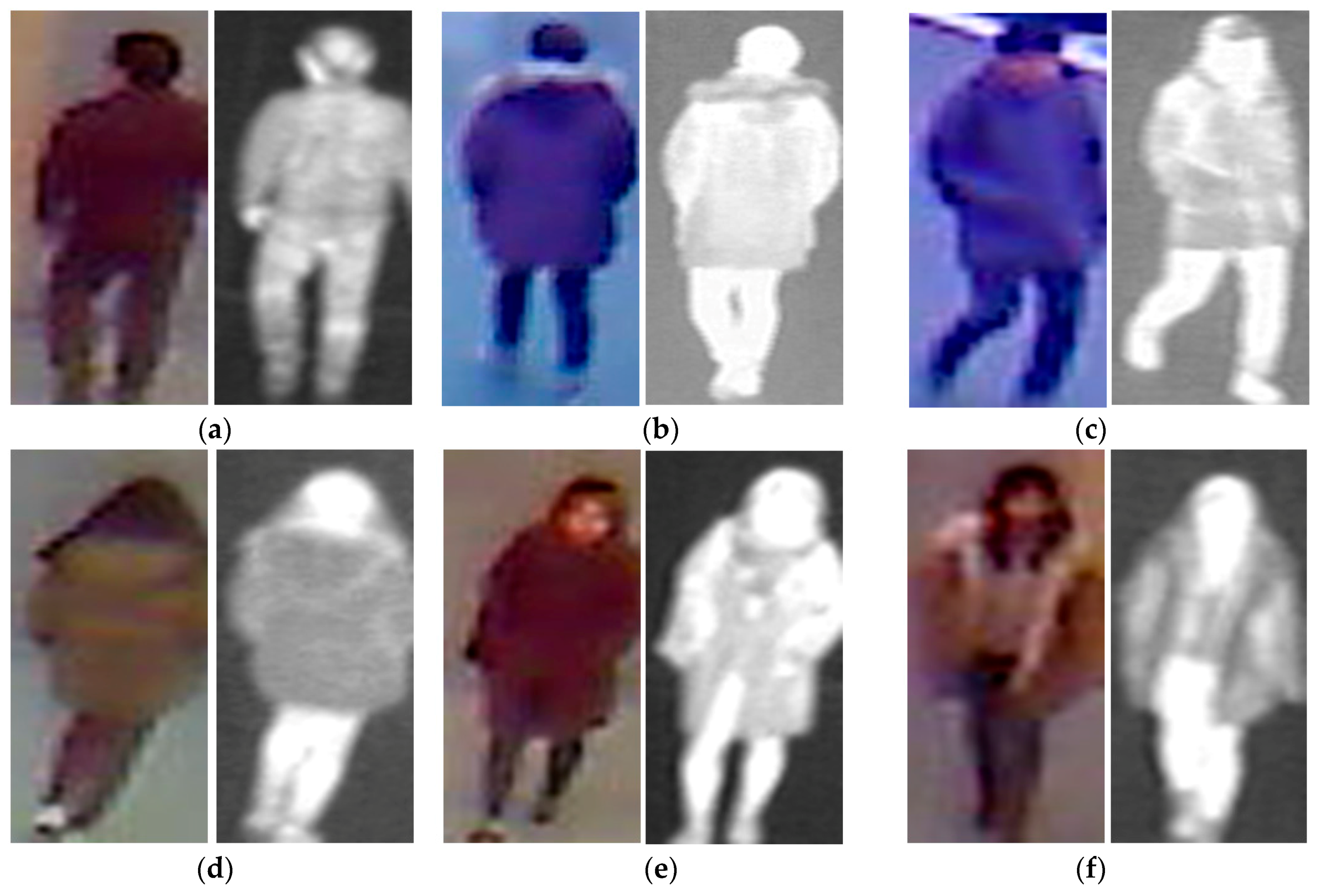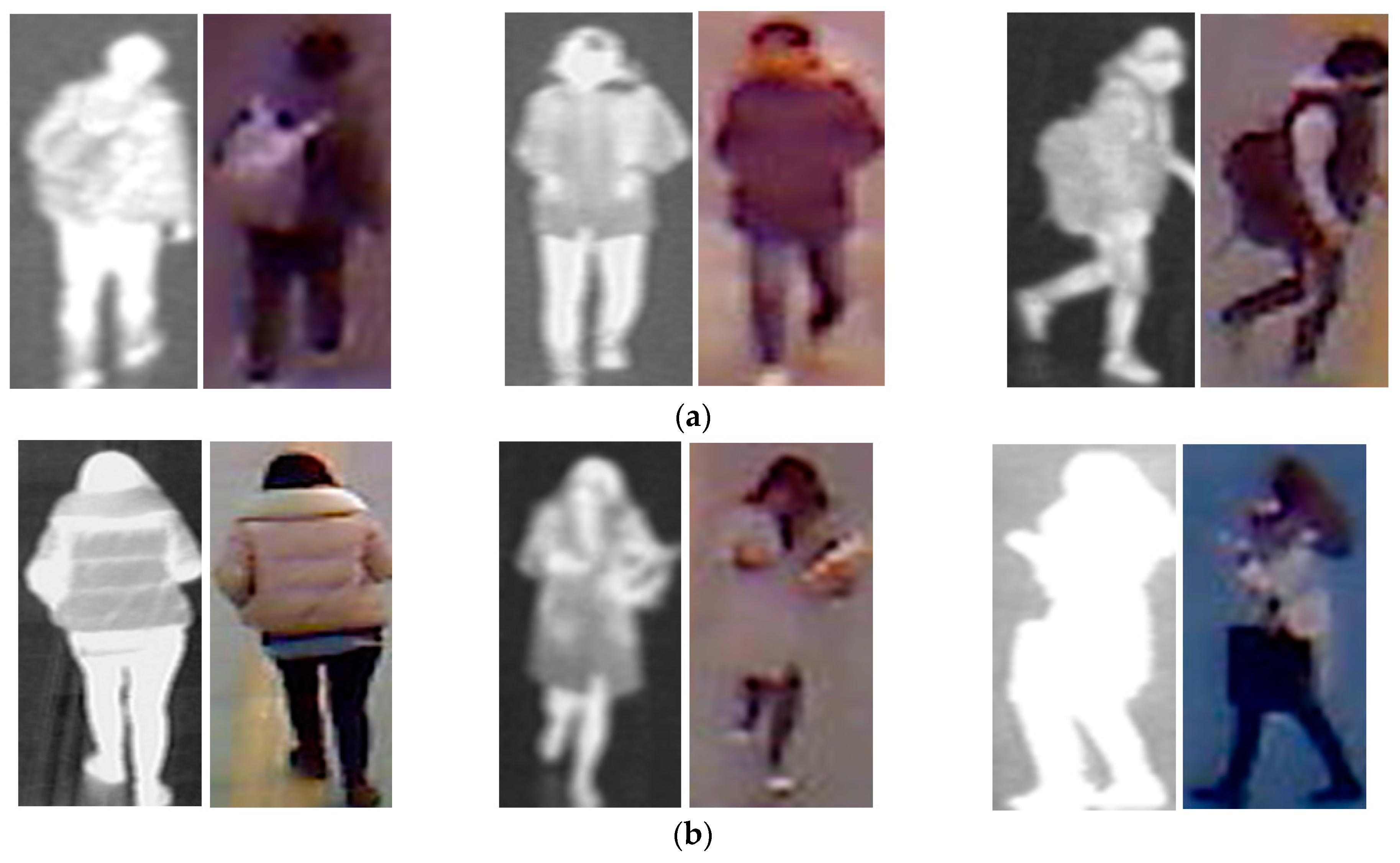 Sample images in our self-established collected database: (a) thermal-visible image pairs of male persons; and (b) thermal-visible image pairs of female persons.
