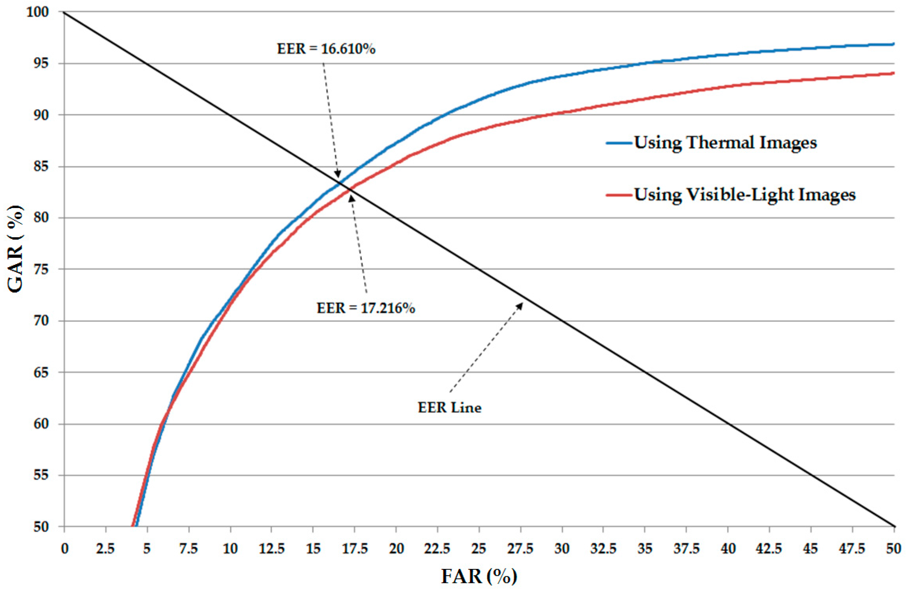Similar to previous studies on body-based gender recognition [5,12], we used the equal error rate (EER) to evaluate the performance of the gender recognition system. The EER is a principal error measurement that has been widely used in recognition systems, such as finger-vein recognition [44,45], iris recognition [46,47], and face recognition [48]. By definition, the EER is the error when the false acceptance rate (FAR) is equal to the false rejection rate (FRR). In our case of gender recognition, we have two classes, male and female. Therefore, we have two possible error cases of “a ground-truth male image that is falsely recognized as female image” and “a ground-truth female image that is falsely recognized as a male image”. In this study, we call the first case of error, where a ground-truth male image is falsely recognized as a female image, as the FAR; and the other error is the FRR. In biometrics studies, we normally use the genuine acceptance rate (GAR) instead of the FRR value for EER calculation. The GAR is defined as (100 − FRR) (%). With the recognition system, we always hope that the error is as small as possible. Therefore, a smaller value of EER indicates a better recognition system. In our experiments, the final recognition accuracy (EER) of the recognition system is measured by averaging the EERs of five testing databases. In addition, the FAR-GAR pair-value is shown in bold type at the corresponding EER point in our experimental results in Table 5, Table 6, Table 7, Table 8 and Table 9.