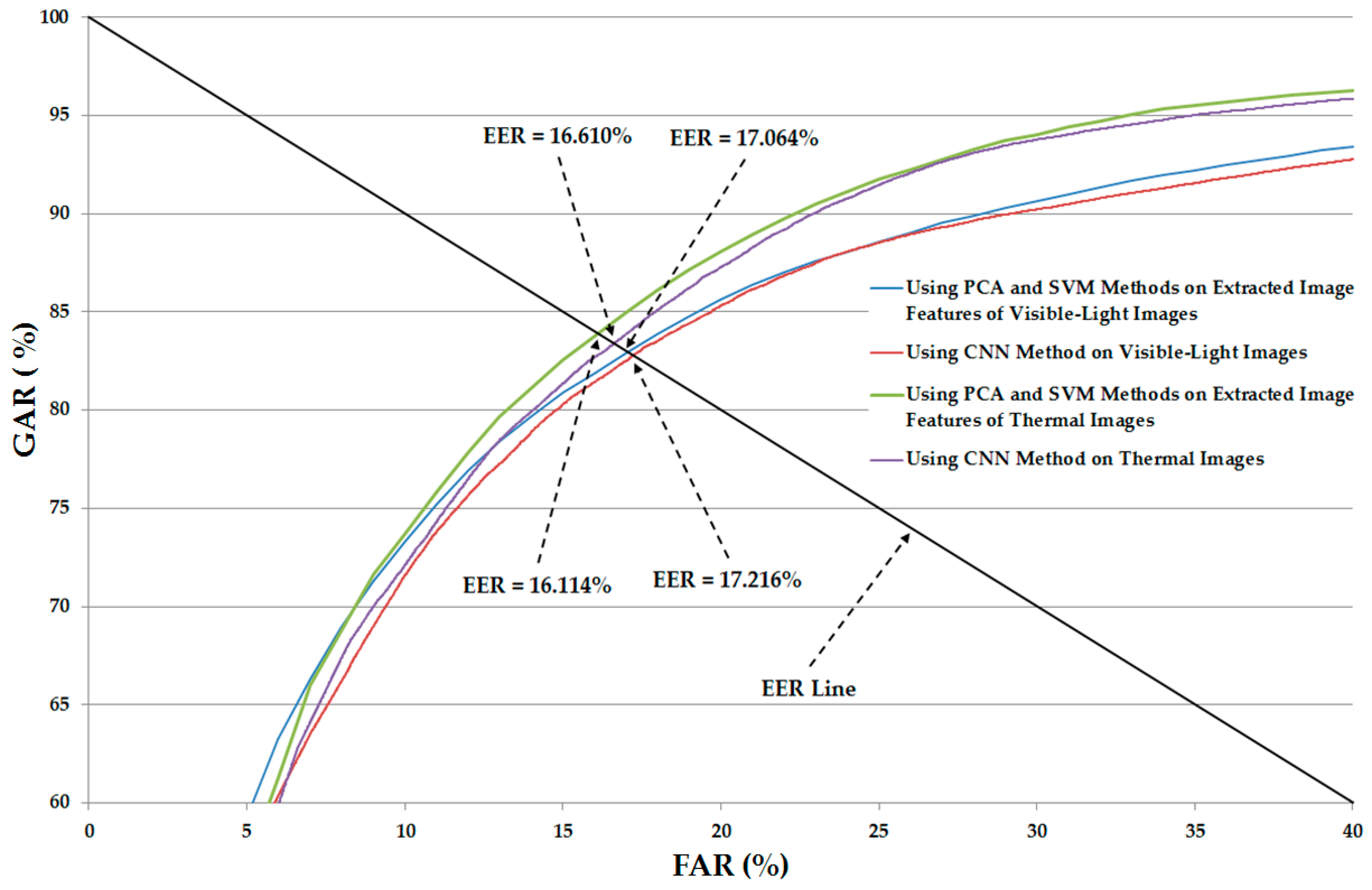 Table 7 shows the recognition accuracies of the recognition system, and is similar to Table 6 except for the case of applying the PCA on the extracted image features for noise and feature dimension reduction. As shown in this table, the linear kernel outperforms the RBF kernel for gender recognition. In detail, using only visible-light images, we obtained an EER of 17.064%, which is lower than the EER of 17.489% produced by RBF kernel. This recognition accuracy is also lower than that of the recognition system that uses the CNN-based method (EER of 17.216% in Table 5) and the system that uses SVM without PCA (EER of 17.379% in Table 6). Using only thermal images, we obtained an EER of 16.144%. This EER result is also lower than the EER of 16.610% of the system that uses the CNN-based method (Table 5) and 16.510% of the system that uses the SVM without PCA (Table 6). From the experimental results in Table 5, Table 6 and Table 7, we conclude that gender recognition based on the SVM method is comparable with that of the CNN-based method when using a single type of human body image for gender recognition. In addition, the PCA method is sufficient for enhancing the recognition accuracy. In Figure 7, we show the ROC curves of various recognition system configurations that use only visible-light or only thermal images for gender recognition. This figure again confirms that the recognition system that uses the SVM and PCA methods (SVM-based method) for gender recognition outperforms the recognition system that uses the CNN-based method.