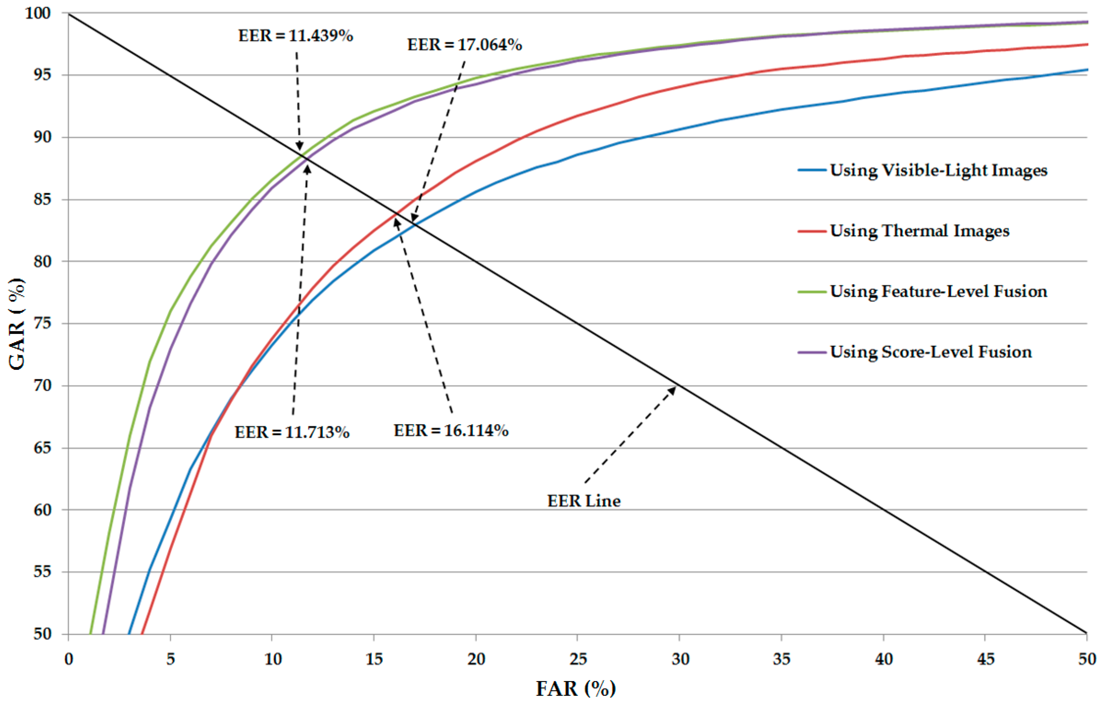 Figure 8 shows the average ROC curves of various system configurations, including the systems using only visible-light or only thermal images for gender recognition and the systems using the combination of visible-light and thermal images (feature-level fusion and score-level fusion methods) for gender recognition. As shown in this figure, the systems using the combination of visible-light and thermal images produced the higher recognition accuracies compared to the systems using a single type of human body images (only visible-light or only thermal images) for the recognition problem. This figure again confirms that the combination of two types of human body images can help to enhance the recognition accuracy.