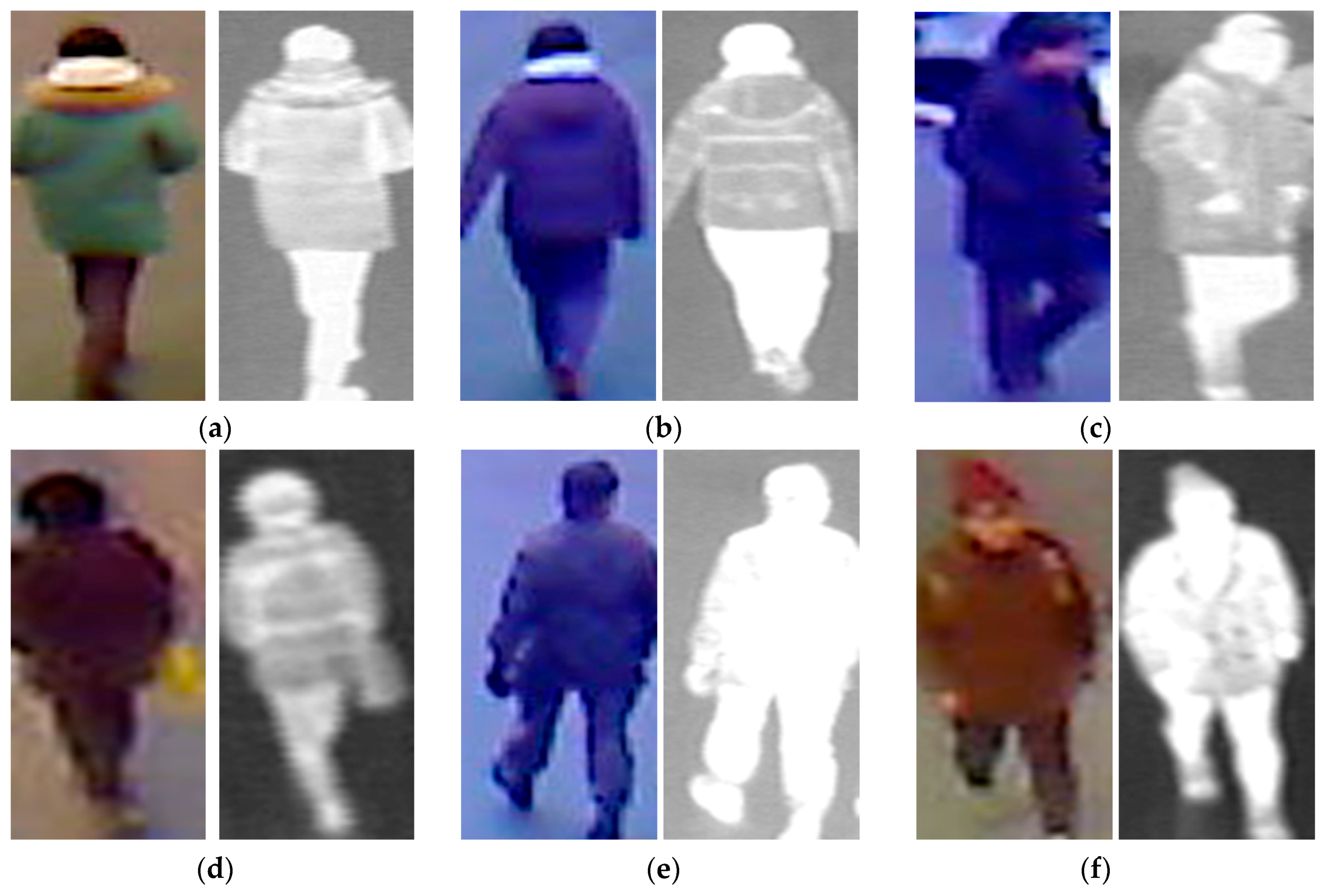 Given that our proposed method uses two different types of human body images for gender recognition, i.e., visible-light and thermal images, as shown in Figure 1, it is necessary to obtain a pair of visible-thermal images simultaneously to recognize the gender of the observed human in our proposed method for gender recognition. Although there are several open databases of the human body images, such as a visible-light database [36,37,38,39,40] or thermal database [41], these databases cannot be used by our proposed method because they contain only single type of human body image (only visible-light or only thermal images). To the best of our knowledge, a public dataset does exist that contains visible-light and thermal images of pedestrians simultaneously that is dedicated to the pedestrian detection problem [42]. However, this dataset was captured at a very far distance between the people and the camera. In addition, the number of persons is too small to be used for gender recognition problem (approximately 40 persons). Therefore, to measure the recognition accuracy of our proposed method, we used our self-established database [12]. A detailed description of our database is given in Table 3. The database contains images from 412 male and female people comprising 254 males and 158 females. For each person, we captured 10 visible-light images and 10 corresponding thermal images. Consequently, we captured 8240 images (4120 visible-light images and 4120 thermal images). All images were captured using our lab-made dual visible-light and thermal cameras that were placed at a height of approximately 6 m above the observation scene to simulate the actual operation of surveillance systems [12]. To the best of our knowledge, there is little previous research on body-based gender recognition using both visible-light and thermal images. As a result, there is no public database for evaluating the performance of such gender recognition systems. Therefore, we make this database available for other researchers to use in their work, from which development and comparison can be performed [43]. Some sample human-body-region images in our database (human body region images) are shown in Figure 5. As shown in this figure, our database contains male and female images with a large variation of texture and body poses.