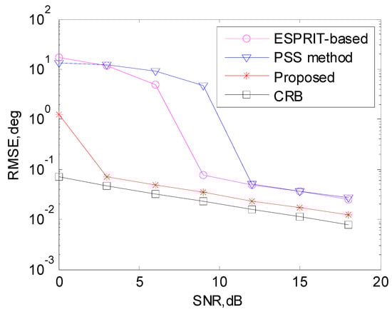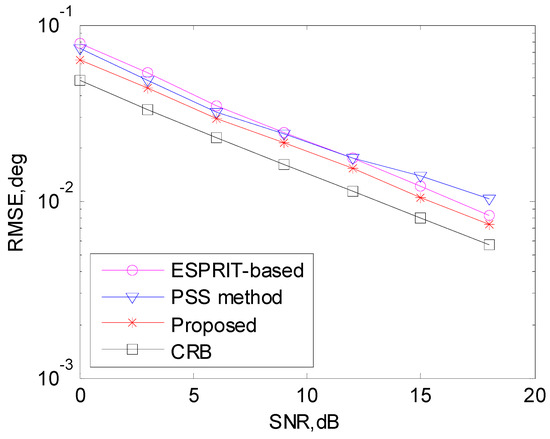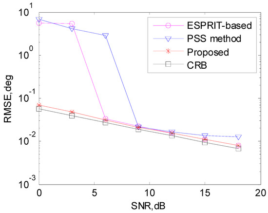 The DOA estimation performance comparison is shown in Figure 3, and it is indicated that our algorithm has better DOA estimation performance than the PSS method and the ESPRIT-based method due to the extended aperture and automatically solutions from the two subarrays. Due to the self-limitation of peak search based method [20], the PSS method performs worse than the ESPRIT-based method with high SNR.