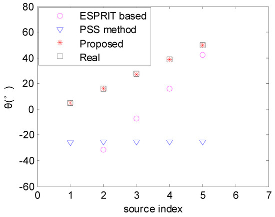 Figure 4 shows the DOA estimation results when the source number is K = 5, and the angles of the sources are uniformly distributed among the range [5°, 50°]. As M < N, the maximum source number that the PSS method and the ESPRIT-based method can handle depends on the minimum aperture between the two subarrays, i.e., (M − 1) = 4. In contrast, the proposed algorithm can deal with min(2M − 1, N − 1) = 6 sources due to the aperture extension in Section 3.1. Thus, Figure 4 verifies that the proposed algorithm can handle more sources than the PSS method and the ESPRIT-based method.