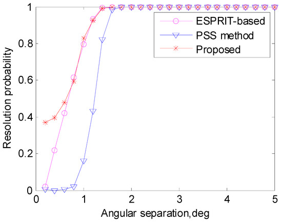To clearly observe the resolutions of the algorithms, we use resolution probability to investigate the DOA estimation performance versus angular separation in Figure 6. The two DOAs are and , where denotes the angular separation. The two sources can be resolvable if both and are smaller than [20]. The SNR is set to 10 dB, and it is shown that the proposed algorithm achieves the best resolution performance among the algorithms.