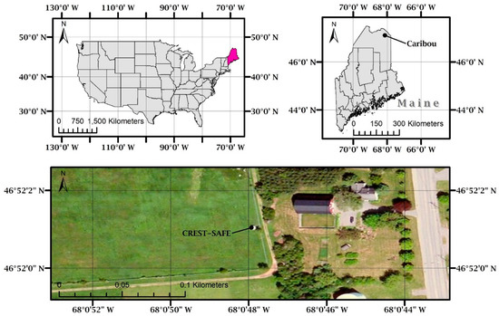 In situ observations were performed in the county of Caribou in the state of Maine located in the Northeast of the United States of America. The coordinates for the study area are 46°55′ N, 68°01′ W (Figure 1). The site is apt and suitable for snow research, given how it is covered in snow from late November to early April. Average seasonal snowfall is 2.8 m, with a record high of 5 m. Seasonal snow accumulation typically reaches its maximum (around 50–60 cm) by late February or the beginning of March. The region is categorized as gentle rolling terrain with low-rounded mountains that elevate from 120–300 m, and, approximately, half of the land adjacent to the study area is agricultural. The rest is considered to be spruce fir forests and maple beech birch. Forest fraction increases from southeast to northwest in the region. Four active United States Geological Survey (USGS) gauges record streamflow information of the Aroostook River, as well as other smaller rivers and streams. Snowmelt water presents the majority of the yearly runoff (daily averages from as low as 6 (January/February) to 57 (April) m3·s−1, monthly averages from as low as 1.5 (January/February) to 16 (April) m3·s−1, and an annual average of ~ 4 m3·s−1) (https://nwis.waterdata.usgs.gov) to local rivers.