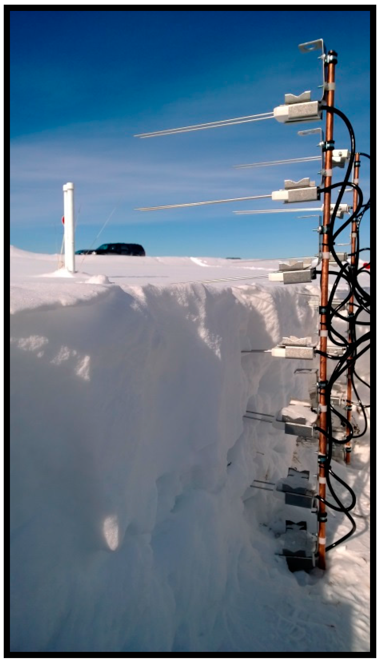 - Stein, J.; Laberge, G.; Lévesque, D. Monitoring the Dry Density and the Liquid Water Content of Snow Using Time Domain Reflectometry (TDR). Cold Reg. Sci. Technol. 1997, 25, 123–136. [Google Scholar] [CrossRef]