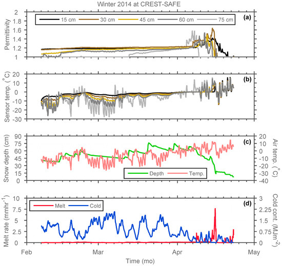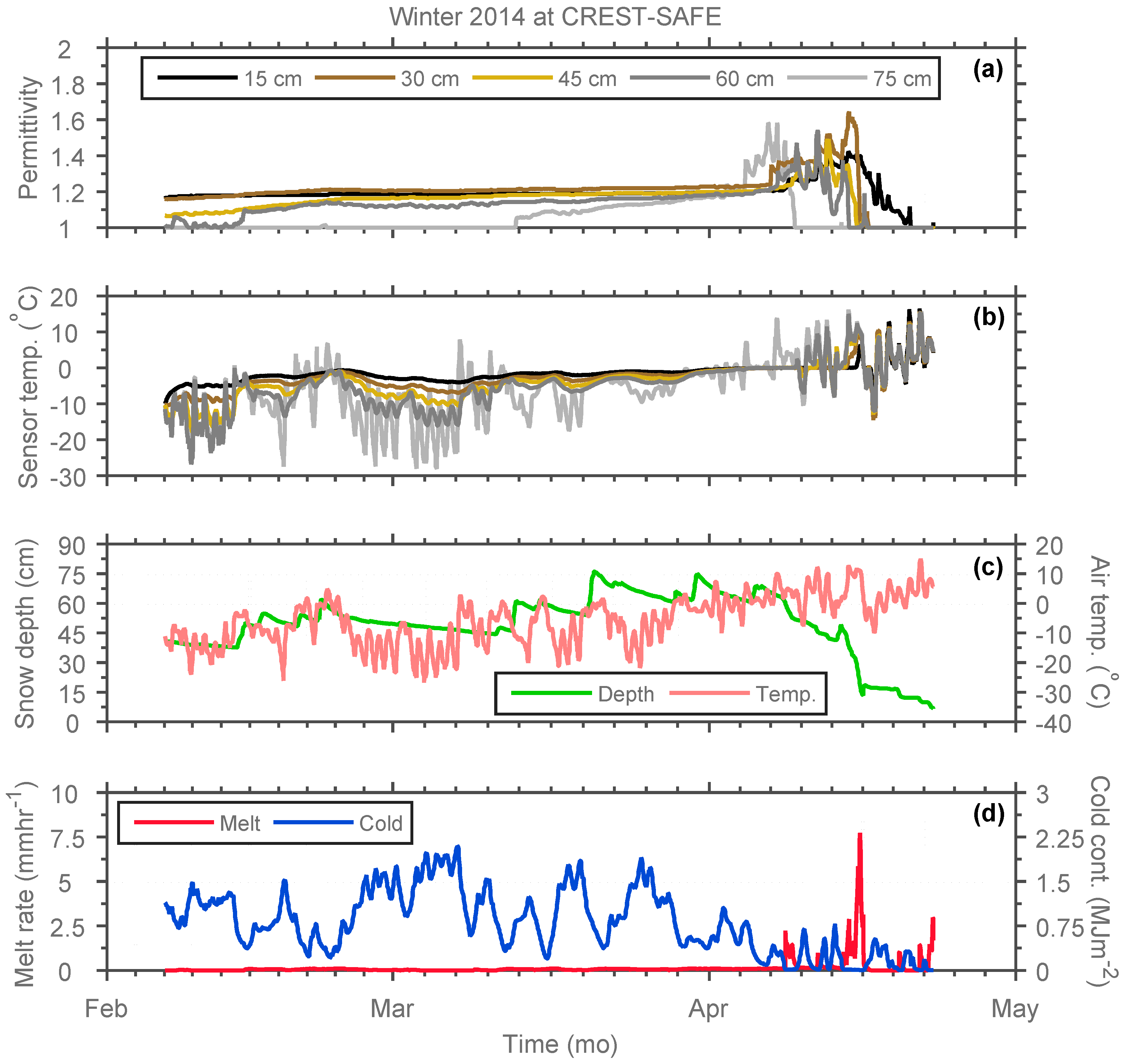 Snow Wetness Profiler snowpack dielectric permittivity (a) and temperature (b) measurements at different depths (15, 30, 45, 60 and 75 cm) above the soil surface at CREST-SAFE for winter (6 February–22 April) 2014; The third panel (c) illustrates snow depth (ultrasonic depth sensor) and near-surface air temperature (temperature and relative humidity probe) observations also collected at CREST-SAFE for the same period of time; The bottom panel (d) shows SNTHERM snowpack melt rate and cold content simulations obtained by weather-forcing the model with CREST-SAFE in situ meteorological data for the same time interval. All data are hourly.