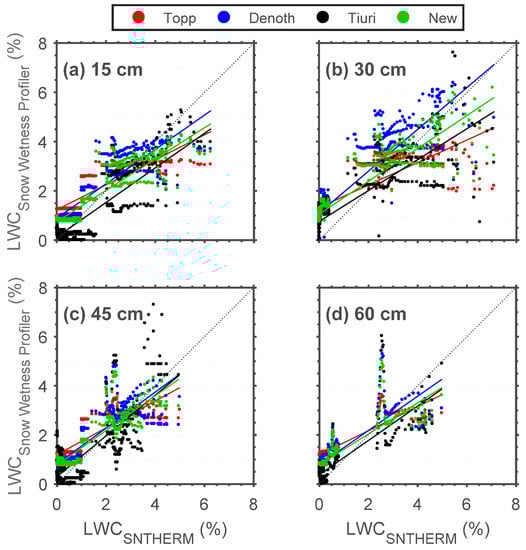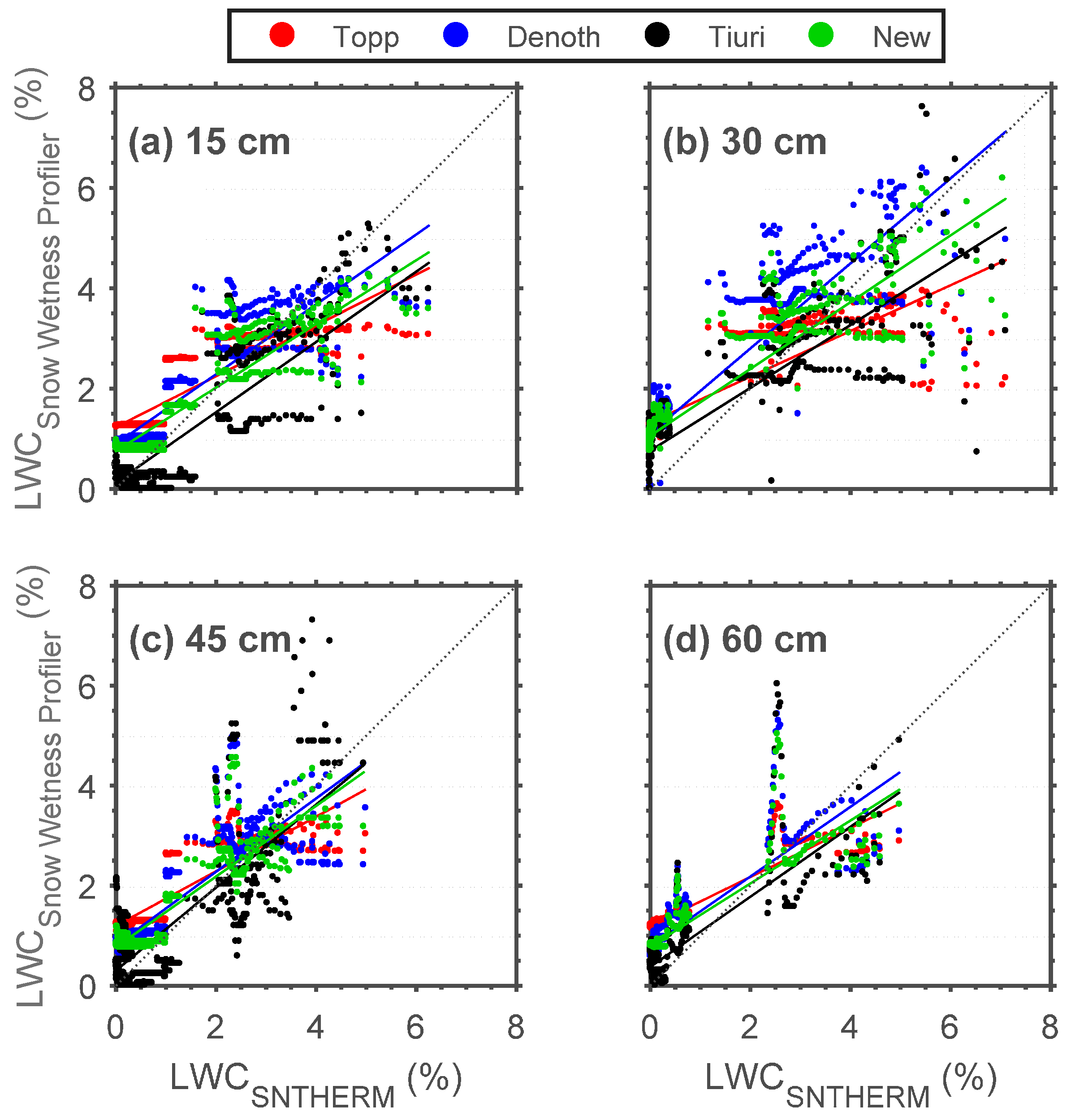 Snow Wetness Profiler (y axis) (estimated using Topp, Denoth, and Tiuri empirical formulas and developed statistical relationships) vs. SNTHERM (x axis) LWC scatter plots for different depths ((a) 15, (b) 30, (c) 45, and (d) 60 cm) above the soil surface at CREST-SAFE for winter (6 February–22 April) 2014.