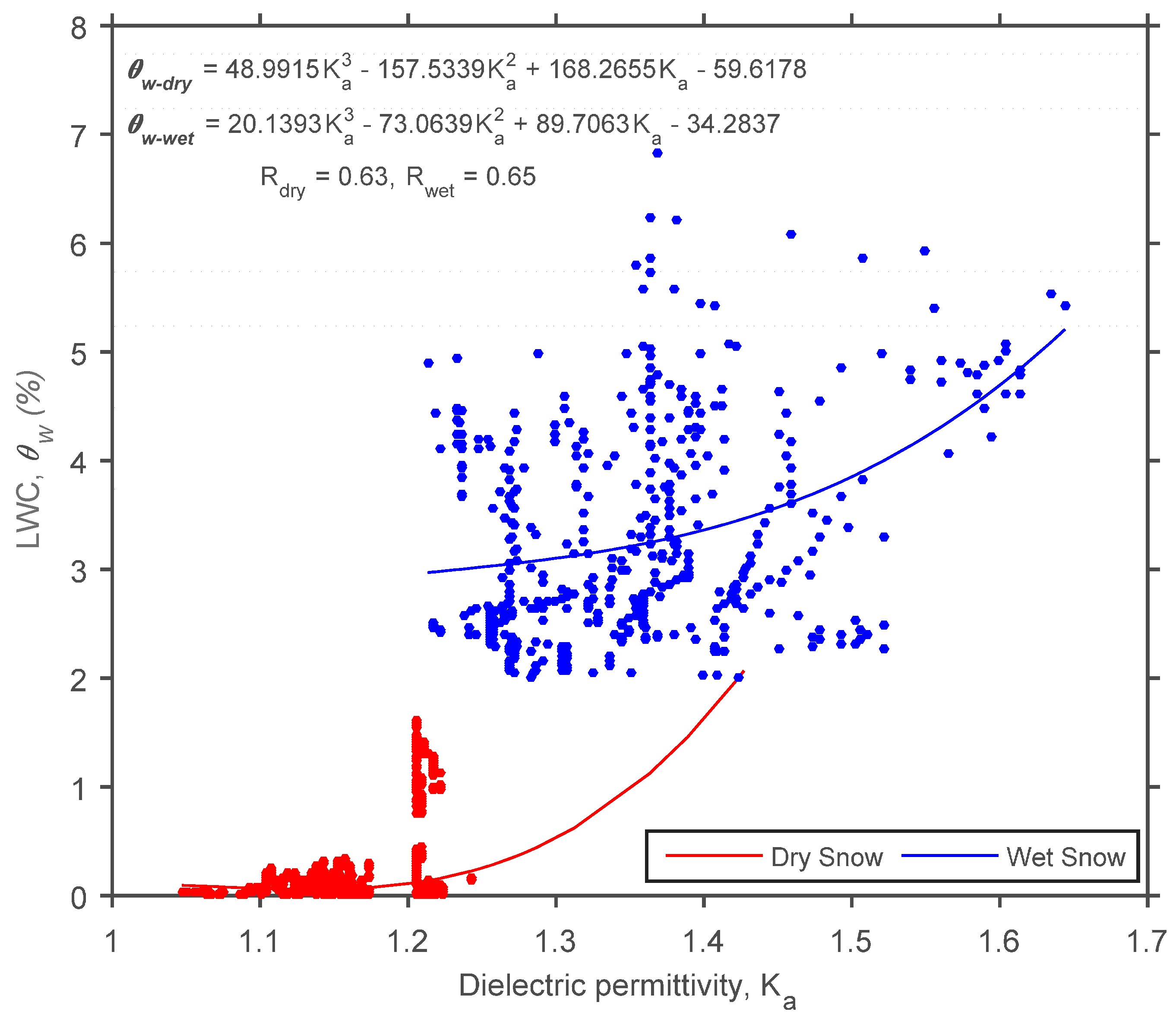where is the LWC of dry snow, is the LWC of wet snow, and is the dielectric permittivity. The regression models exhibited correlations of R = 0.63 and R = 0.65 for dry and wet snow, respectively. The calibration results for these statistical relationships are shown in Figure 4.