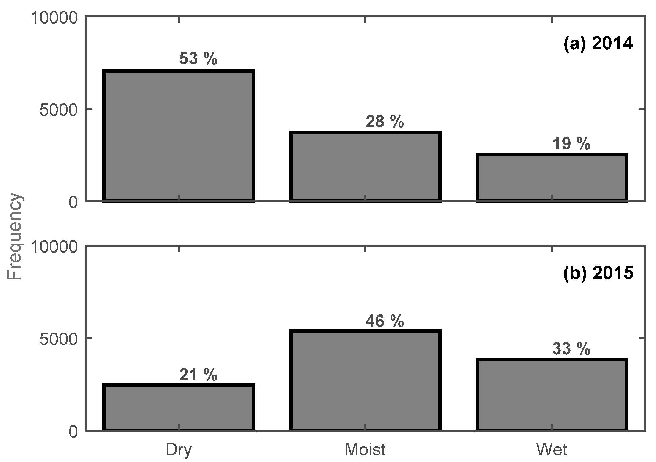 Frequency distribution for dry, moist, and wet snow conditions at CREST-SAFE for winters (a) 2014 and (b) 2015.