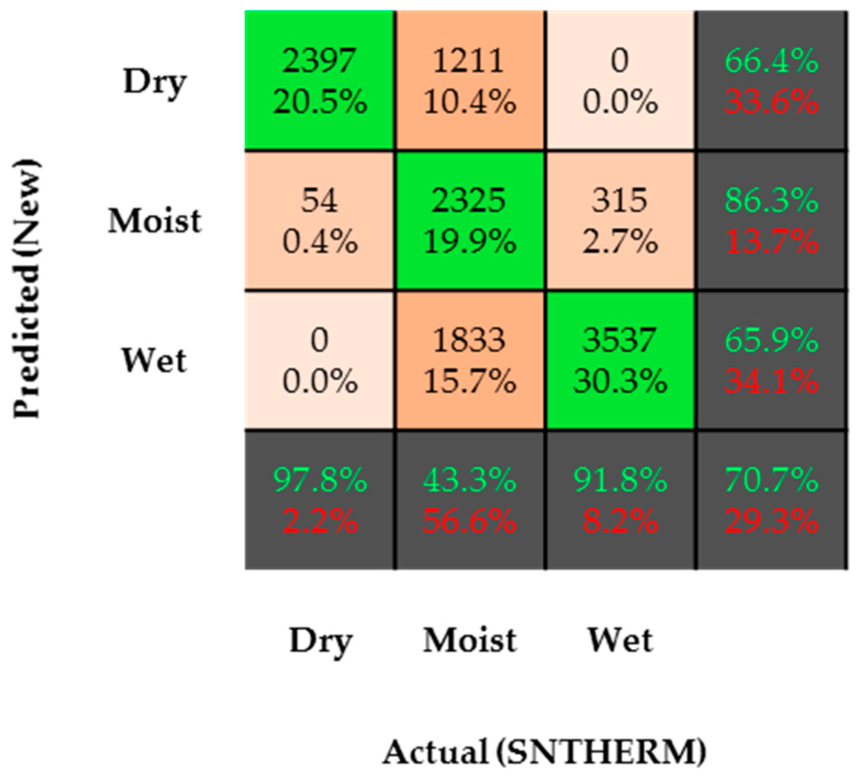 In general, a confusion matrix is a table that is often used to describe the performance of a model (equation or set of equations) on a set of test data (SNTHERM, in this case) for which the true values are known [83]. In this confusion matrix, there are three predicted (new statistical relationships) and actual (SNTHERM) classes (dry, moist, and wet snow). These make up a total of nine class comparisons. In Figure 7, numbers represent the amount of observations that make up a class comparison.