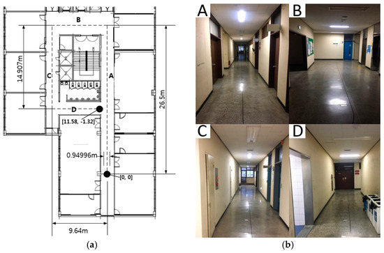 The test area for magnetic field map navigation: (a) map of the test area divided into four sections: A, B, C, and D; and (b) photos of the test corridor.