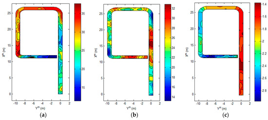 The magnetic field map used in this paper was built with magnetic field data from the 7th floor corridor of the 10th engineering building in Pusan National University. This area is shown in Figure 2. The reference system moves from position (0, 0) to position (11.58, −1.32) in the corridor. The magnetic field was measured with 55.88 mm spacing in the direction of mobile robot movement with a width of 0.94996 m (). In order to reduce the error in the magnetic field map, every magnetic sensor was calibrated [13], and the magnetic field was measured several times by changing the position of the sensor. Finally, the magnetic field maps about each axis can be obtained. The magnetic maps created are composed of X, Y, and Z-direction magnetic field maps [13,16,22]. These maps are represented as , , and , where .