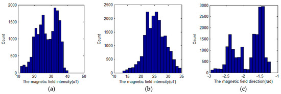 The histograms of the magnetic field maps. (a) The X-Y magnetic field map; (b) Z-direction magnetic field map; (c) Direction magnetic field map in the horizontal plane.
