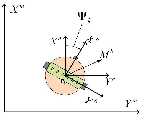 The estimated position is expressed in relation to the main frame in this paper. Since the sensor data are measured in the body frame, axis definitions and transformations are required. Figure 5 shows various frames. The mobile robot position is at time k in the fixed main frame. The navigation frame is parallel to the main frame, but the center of the navigation frame is at the center of the mobile robot [25]. The body frame is the center of the robot. The X-axis of the body frame is the same direction as the head direction of the robot. The Y-axis is the direction to the right, and the Z-axis is directed down the mobile robot. Angle is the difference in the angle between the X-axis of the body frame and the X-axis of the navigation frame.
