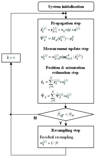 where N is the number of particles, and N = 1000 in this system. After the residual resampling, the weight of all particles is equalized to 1/N. Figure 7 shows the flowchart of the proposed particle filter system.