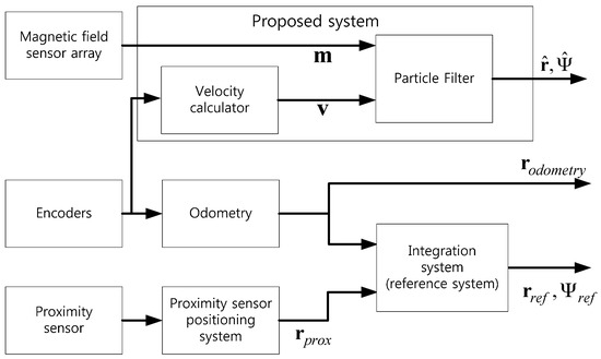 In order to solve these problems and to increase performance, we propose a particle filter system that integrates magnetic field map navigation and an encoder system. In the propagation step, the proposed system determines velocity by using encoders instead of the INS to avoid the divergence problem without error correction. In order to use the encoder, the error characteristics of the encoder must first be known. The encoder system has two categories of error [18,19]. One is systematic errors from unequal wheel diameters, misalignment of wheels, or limited encoder resolution and limited sampling rates. The other is non-systematic errors from travelling over uneven floors and from wheel-slippage. If these errors accumulate over time, the estimated position of the mobile robot can diverge from the real position [20,21]. However, the encoder system is free from the divergence problem when velocity is calculated because the current velocity of the encoder system is not affected by the previously measured velocity. Therefore, the particles can be propagated by using the velocity of the encoder system without encoder error correction. In the measurement update step, multiple magnetic sensors and three magnetic field maps (a horizontal intensity map, a vertical intensity map, and a direction information map) are used to make the measurement PDF, which update the weights of particles. Also, in this paper the mobile robot’s orientation is computed by using only the magnetic field map without any other sensor, such as the encoder or the INS.