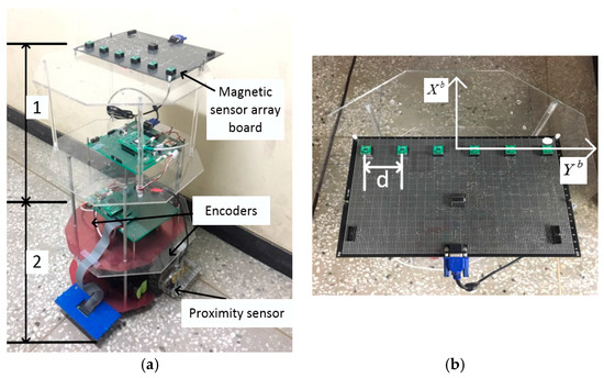 The mobile robot system. (a) Section 1 is the measurement and data transmission unit, and Section 2 is the control unit; (b) The magnetic sensor array board.
