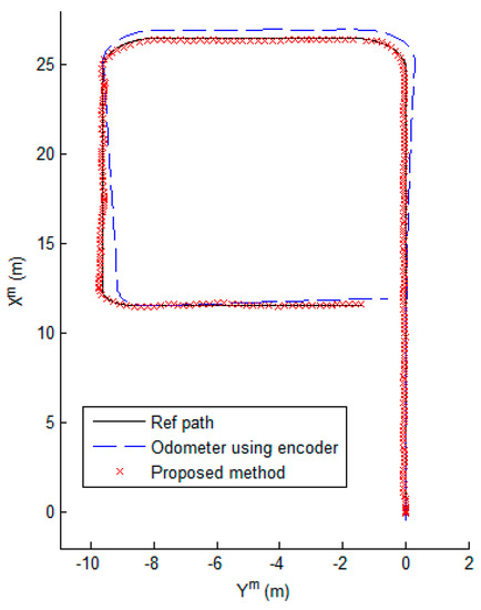 Figure 2 shows the path of the mobile robot in the corridor. A tracking line was installed along the center of the corridor. The proximity sensor’s landmarks were installed at known positions. The mobile robot moved from (0, 0) to (11.58, −1.32). Before the mobile robot departed, the particles were updated many times. The system was then able to operate stably. When the mobile robot moved along the predetermined path in the corridor, each sensor’s data and the reference data were transmitted periodically. Finally, the proposed algorithm was executed by the PC twice per second.