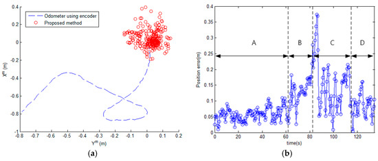 The position error of the mobile robot. (a) Comparison of the odometry position errors and the proposed method’s position errors; (b) The distance errors of the proposed method. A, B, C, and D are the sections of the test corridor, as shown in Figure 2.