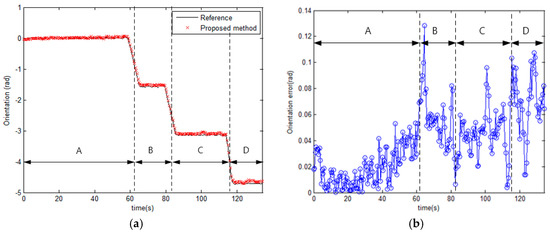 The estimated orientation from the proposed method. A, B, C, and D represent the sections of the test corridor, as shown in Figure 2. (a) The estimated orientation and the reference orientation; (b) The errors from the estimated orientation.