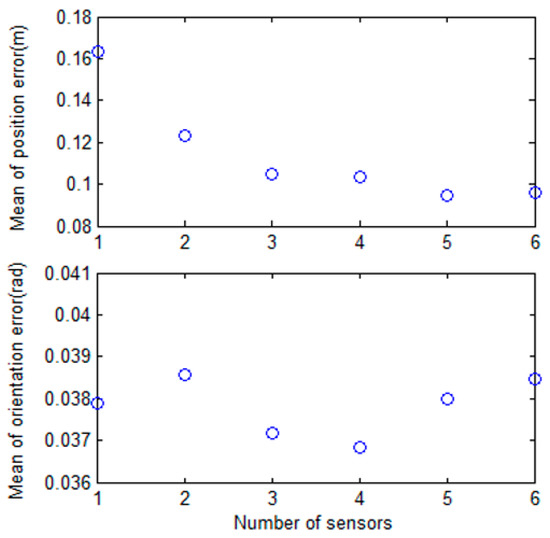 The results depending on the number of sensors used. The upper figure shows the mean of the distance error for the estimated position. The mean of the orientation error is shown in the lower figure.