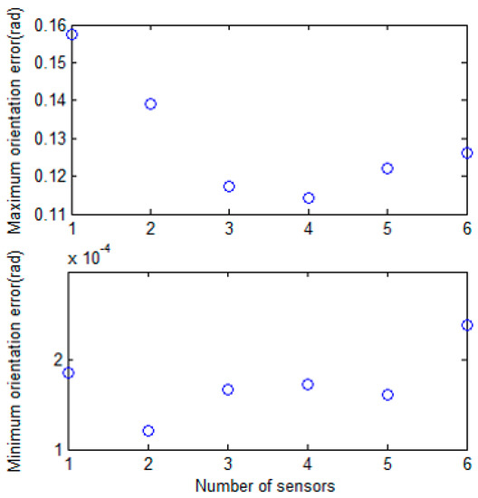 The maximum and minimum orientation error results depending on the number of sensors used.