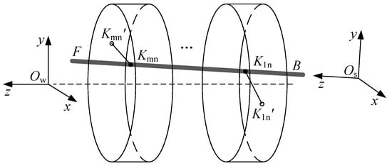 For the position error formed by the installation of the rod relative to the part, when the rotary axis of the measuring rod is completely coincident with the centerline of coaxial holes, the irregular conical surface’s directrix FB and the Ow-Z axis are collinear, so the spot trajectory {Kmn’} formed by laser beams is located in an ideal circle with radius rm. As FB is not coincident with the Ow-Z axis, Spot’s trajectory {Kmn’} forms a three-dimensional curve, as shown in Figure 6.