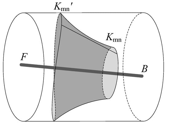 For the position between laser beam KmnKmn’ and rotary axis FB, when KmnKmn’ is perpendicular to FB, the angle γm between KmnKmn’ and the Os-xy plane is equal to zero, so the swept surface formed by laser beams is a circular plane that is perpendicular to FB. When γm ≠ 0, and the vertical distance dm between KmnKmn’ and FB is equal to zero, the swept surface is a cone, and FB is the directrix of the cone. When γm ≠ 0, and dm ≠ 0, the swept surface is an irregular conical surface, as shown in Figure 6, the generatrix of the conical surface is a curve at the top Kmn, and a straight line near the bottom Kmn’.