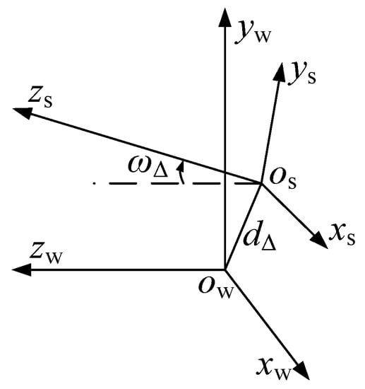 In the transition matrix, the unknowns are Δx, Δy, εx, and εy. We only need to calculate the roundness error and flatness error of the curve {Kmn’}, so the conversation can be simplified into the position relationship between the Os-Z axis and the Ow-Z axis, and it is expressed by eccentricity distance dΔ and deflection angle ωΔ, as shown in Figure 7.