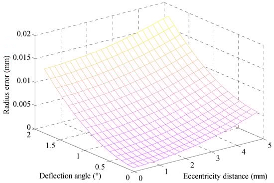 Figure 9 shows the final radius error of the spot trajectory in different eccentricity distances and deflection angles. As ωΔ < 1.5° and dΔ < 3 mm, the radius error is less than 10 μm. While installing the measuring rod, for the distance between the rod’s two ends and the part’s centerline, it is to be a small range of no more than 2.5 mm. Through this operation, the radius error of the spot trajectory formed by the laser beam does not exceed 10 μm. If we can achieve a higher installation accuracy, more precision radiuses can be calculated for the coaxial holes.