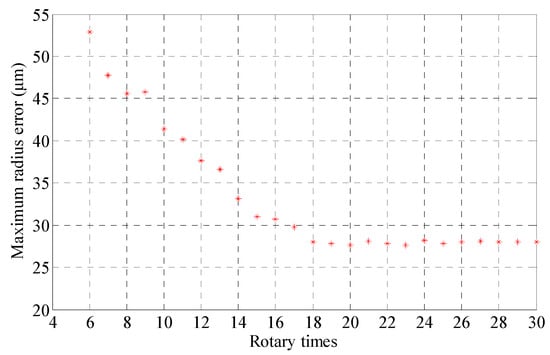 The comparison between the measurement result and rotation counts of the measuring rod is shown in Figure 11. It can be seen that: as the rotation counts of the measuring rod exceeded 18, the measurement accuracy stopped around 28 μm.