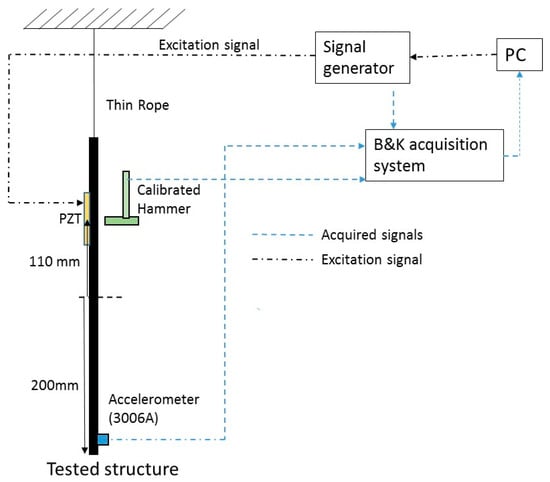 The signals are simultaneously acquired using a B&K LANXI5023 (Bruel and Kjaer, Nærum, Denmark) module with 12 channels. The signals have been acquired with 4096 samples/s in order to analyze the first modes of the structure (analyzed band 0 Hz–1000 Hz). A scheme of the equipment used can be seen in Figure 2.